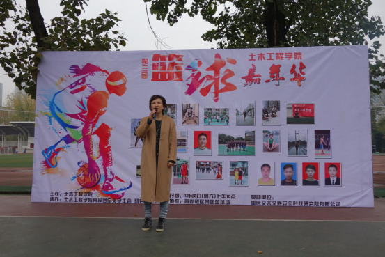 开幕式上土木工程学院舒琳副书记发表讲话,感谢同学们的支持,感谢杰出校友归来,以篮球为媒介,搭建土木之桥,连接土木学子之情,传承土木精神,借篮球嘉年华,进行友谊交流赛,促进土木学子友谊交流。