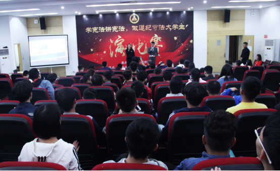 比赛场上其他参赛选手则从多方面论述了宪法对于社会方方面面的重要性和大学生如何遵纪守法。他们思维中洋溢着法制观念的智慧火花在此碰撞、绽放,使得台下观众对于宪法的理解也更加深刻,赢得观众和评委们阵阵掌声。
