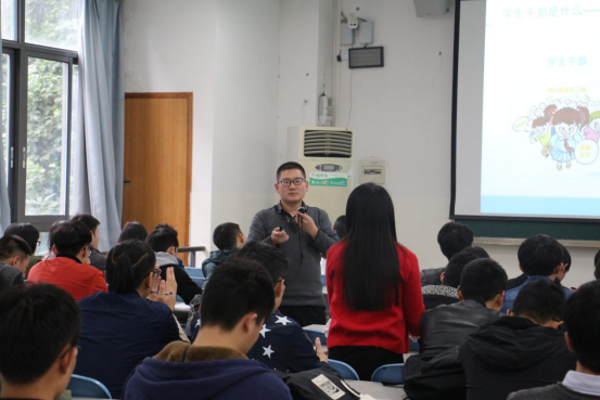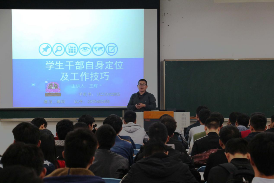 王辉老师从学生干部的定义、学生干部的自身定位、学生干部的工作技巧等三个方面向同学们展开。对于学生干部的定义,王辉老师认为学生干部是指在学生群体中担任某些职务,负责某些职责,协助学校进行管理工作的一种学生身份。他说,学生干部的定位就是优秀的学生干部能够为同学服务,成为老师的助手,从中能够得到锻炼、能够展示个人能力、实力、满足自身领导要求,从而获得自信心和荣誉等。对于学生干部的工作技巧,王辉老师这样说:“作为学生干部,自信、良好的人际交往能力、责任心、情绪掌控能力是必不可缺的。”王辉老师还强调,学习是学生的天职,只有将自身的学习搞好,才能成为同学们认可的模范领导。