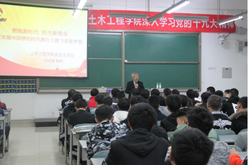 11月26日19点,土木工程学院关于党的十九大精神宣讲会在双福校区A01110顺利召开,此次宣讲会由我院党总支书记向中富教授主讲,他带领着我院双福校区学子一同深入学习了党的十九大精神。
