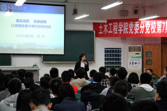 3月26日晚7点,土木工程学院党委副书记舒琳在南岸校区20307教室开展了以“端正动机,完善自我,让青春在奋斗和付出中闪光”为题的党课。南岸研究生与本科生入党积极分子参与了本次党课的理论学习。