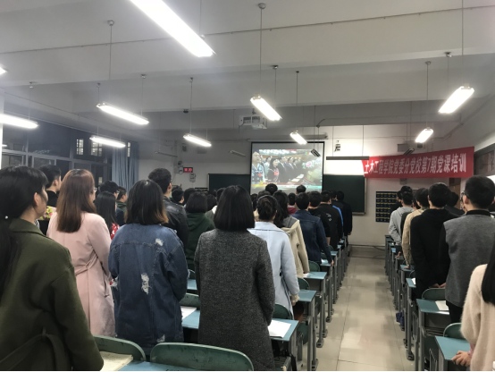 为了让积极分子有更直观的感受,王老师特意播放了十九大开幕式的片段,当画面中李克强总理提议“全体起立,唱国歌”时,积极分子们情不自已地站起身来,同唱国歌。同时,他也不忘引用一些媒体的评价,全方位地展现了这次会议的地位及历史意义。带领积极分子们浏览了十九大报告中的主要内容,对其中的焦点进行了进一步分析。
