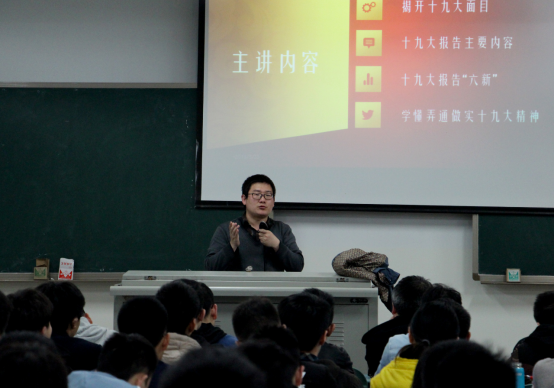 王辉老师首先以抽问的方式简要介绍了从中共一大到十九大的历史,渲染出了十九大召开的整体背景,针对一些重要转折点,他还特别强调了其中的种种细节。讨论至十九大,王辉老师让到场学生回答了关于十九大的主题等问题,通过这一系列问答,入党积极分子们对党的十九大有了更加深入且全面的认识。