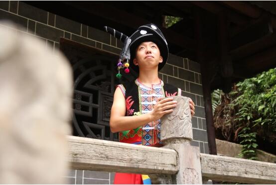 廪君殿内,溯本求源。团队摄影郭东灵、罗成在倾听了土家先人廪君巴务相率部在扩大领地,开发疆域过程中与盐阳女神相恋又死别的故事后,突发奇想地想用镜头将传说记录下来,于是来自土家族的队长王思宇饶有兴致地穿上本族服饰,成为团队土家族微纪录片中廪君的扮演者。